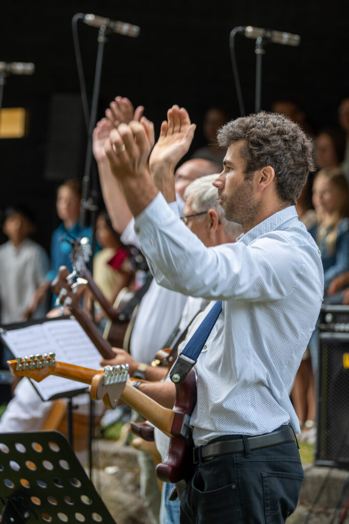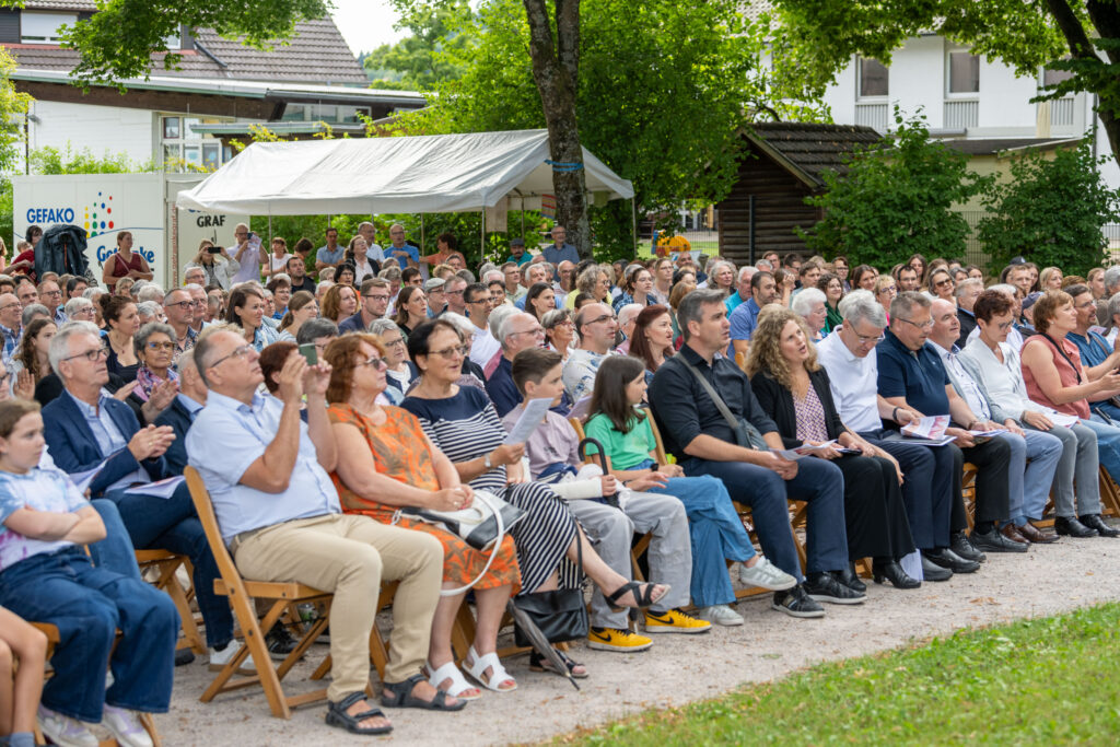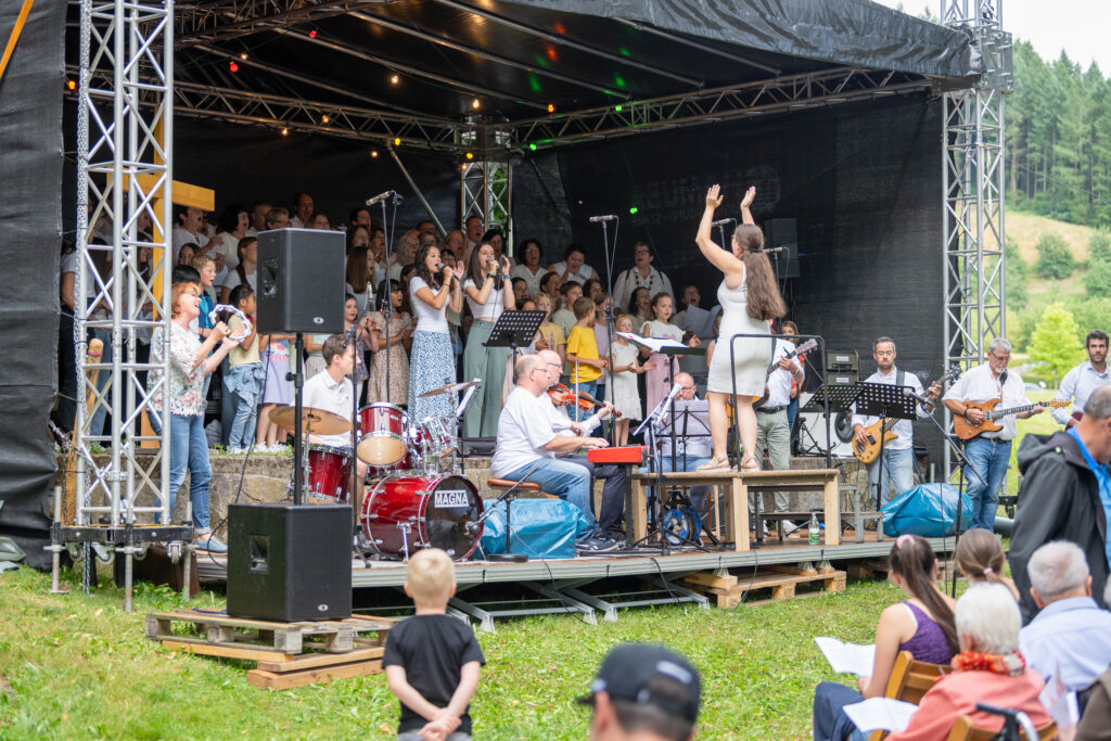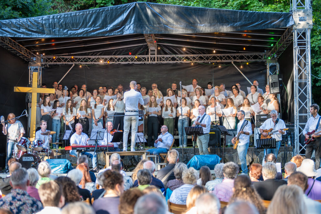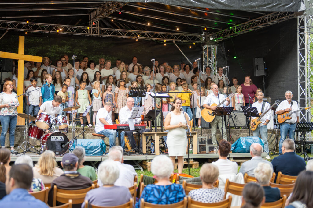 Trotz anfänglicher Wetterunsicherheit und Regenschauer vertrauten die Organisatoren auf besseres Wetter – mit Erfolg: Pünktlich zum Konzertbeginn brach die Sonne durch die Wolken. Über 70 Sängerinnen und Sänger, darunter auch der Lautenbacher Kinderchor und engagierte Firmlinge, erfüllten den Park mit kraftvollen Liedern wie „10.000 Gründe“ und „Preis den Herrn“.